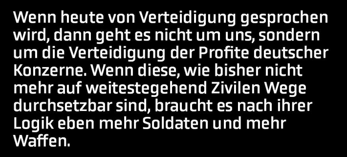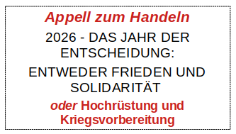 Die von der Evangelischen Kirche Deutschlands (EKD) verabschiedete Denkschrift „Welt in Unordnung – Gerechter Friede im Blick“ liest sich wie eine Kopie der Politik der Bundesregierung, indem sie die vorherrschenden Konfrontations- und Aufrüstungspolitik ein christliches Mäntelchen umhängen will und dient damit als Steigbügelhalter des Militarismus. Es ist eine klare Abkehr von der Bergpredigt, dort heißt es zur Erinnerung: Selig, die keine Gewalt anwenden – Selig, die hungern und dürsten nach Barmherzigkeit – Selig die Barmherzigen – Selig, die Frieden stiften. Alle noch für Frieden und Verständigung und sozial engagiert lebenden evangelischen Christen müssten auf die Barrikaden gehen und die Pharisäer aus dem Tempel jagen. Auch die erschreckende Erklärung der Deutschen Bischofskonferenz zum Wehrdienst vom 13. Oktober dieses Jahres, bläst in das gleiche Horn.